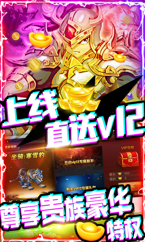 2.上线送vip12,8888元宝,88888绑元,可直接领取vip奖励酷炫称号,酷炫坐骑寒雪豹,贵族专属聊天框!