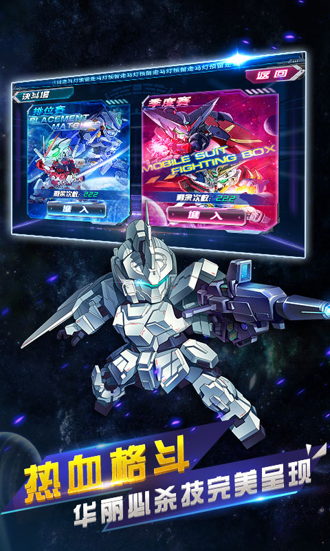《超级机战魂》是一款以搜集/养成/对战为核心的策略回合制手游。玩家可从近300台高达及200位机师中,选择不同搭配的阵容来进行决斗。机体设计由中日画师共同完成绘制,并为热门机体特别绘制了动画。游戏注重将易于上手,简约但不简单的战斗系统和丰富的pvp玩法结合,为您重塑铁血与谋略并存的sd敢达世界。