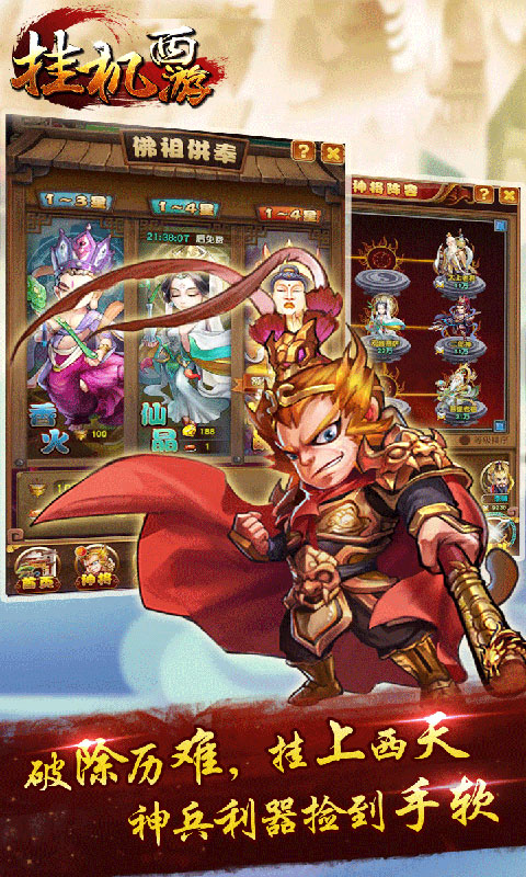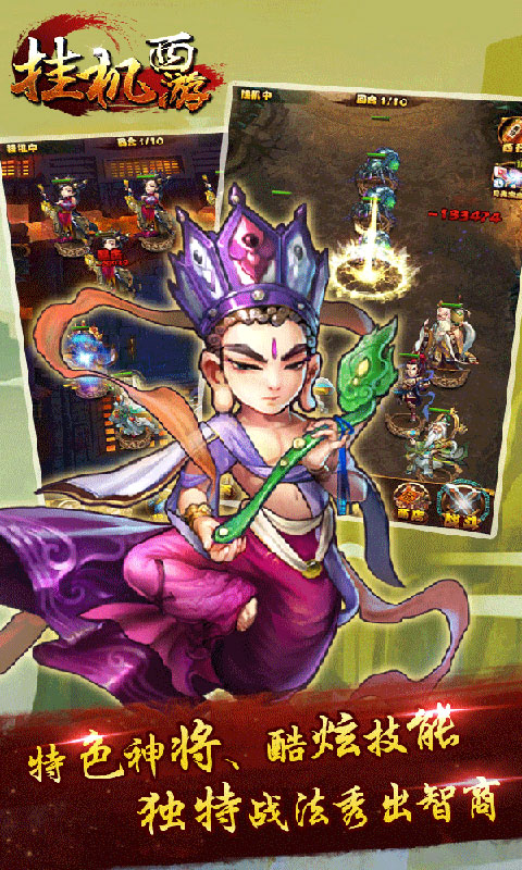 《挂机西游》是一款放置类回合手游。降妖伏魔大闹天宫特色副本花样百出,破除历难挂上西天神兵利器捡到手软,特色神将酷炫技能独特战法秀出智商,玩家可以在游戏中挂机升级、排兵布阵、挑战各色boss,还可以收集各色神将、培养自己的专属互道者,游戏采用回合式挂机玩法,从藏宝阁中换取惊世宝物锻造至强法宝。